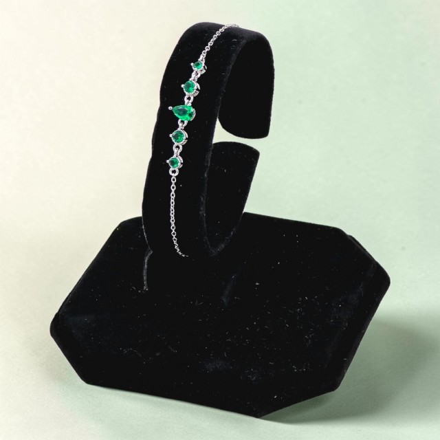 I sentrum står den karakteristiske dråpeformede stenen som gir armbåndet sitt tydelige uttrykk, omgitt av mindre grønne zirkonia som skaper rytme og glans gjennom hele designet. Resultatet er et armbånd som føles både raffinert, levende og tidløst.