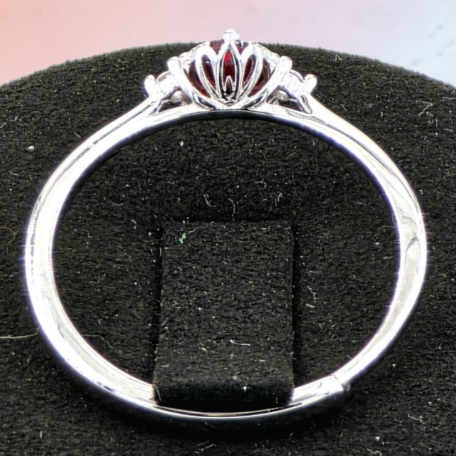 Den røde stenen står i sentrum og fanger lyset med en varm, intens glød. På hver side av hovedstenen fremheves designet av subtile zirkoniadetaljer som tilfører ekstra glans og skaper en balansert ramme rundt smykkets elegante form.