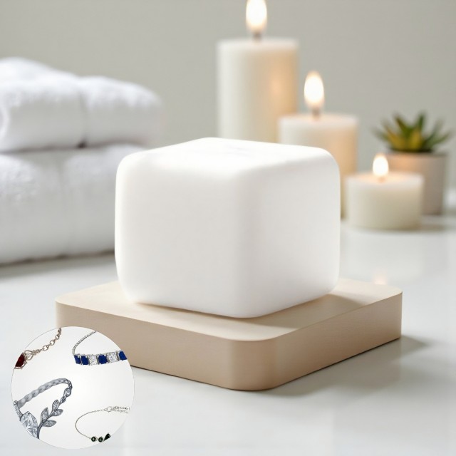 Badebomben kan brukes i fotbad, badekar og lignende områder, og gir en mykgjørende spaopplevelse samtidig som den skjuler et smykke av høy kvalitet!