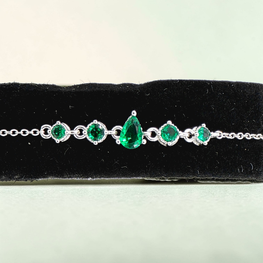 I sentrum står den karakteristiske dråpeformede stenen som gir armbåndet sitt tydelige uttrykk, omgitt av mindre grønne zirkonia som skaper rytme og glans gjennom hele designet. Resultatet er et armbånd som føles både raffinert, levende og tidløst.