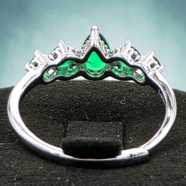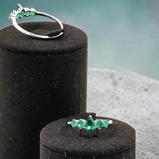 Den dråpeformede grønne stenen står i sentrum og fanger lyset med en dyp, elegant glød. Rundt hovedstenen balanseres designet av flere mindre steiner som tilfører ekstra glans og skaper et harmonisk uttrykk med naturlig flyt i formen.